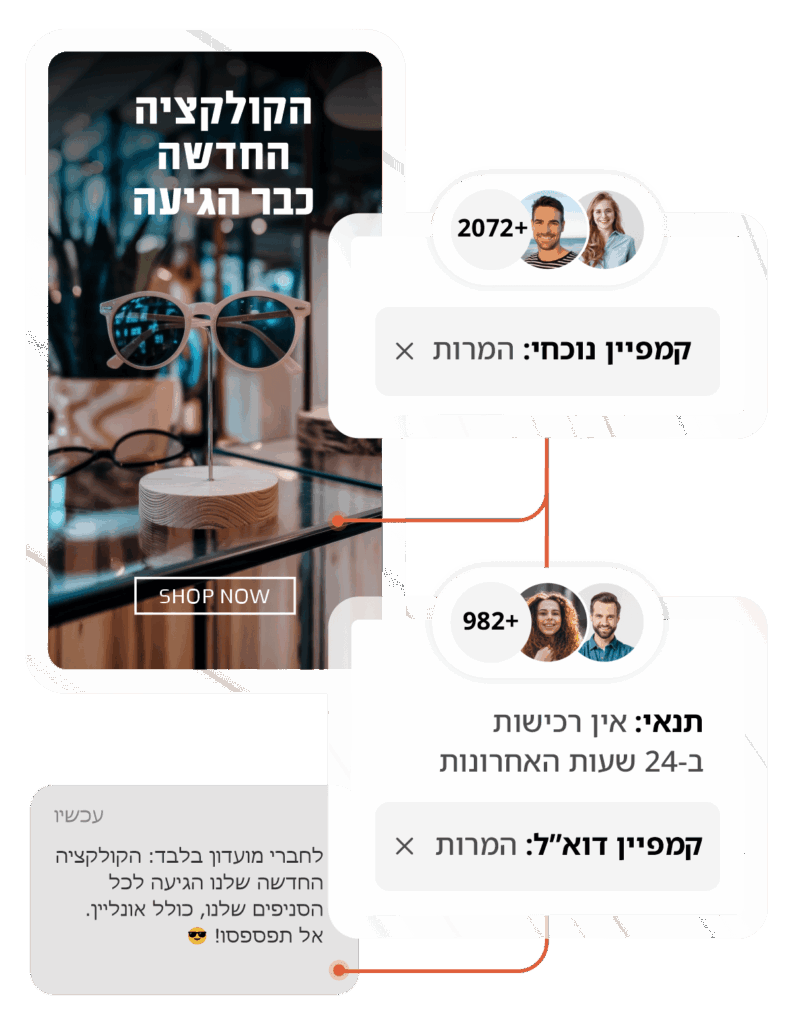 הודעות ברוכים הבאים שמייצרות חיבור רגשי, זרימות שמעירות עגלות רדומות, אוטומציות שיווקיות עם פילוחי קהלים שעוזרים לכם ״להרים כסף מהרצפה״ וקמפיינים שמחזירים לקוחות לקנות שוב – לא כי הצענו להם קופון, אלא כי הם מרגישים שמישהו באמת מבין אותם.